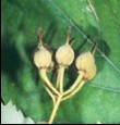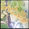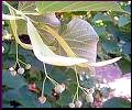 The flowers are pale yellow, hermaphrodite, produced in cymes of three to ten in mid to late summer with a pale green subtending leafy bract. They have a strong scent and are pollinated by honeybees but the nectar is toxic to bumble bees. The fruit is a dry nut-like drupe 8-10mm long, downy, and slightly ribbed.