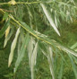 Crack Willow (Salix fragilis). Crack Willow is a deciduous tree up to 20m high, with a short, thick trunk, a deeply ridged bark and a rounded crown. It has wide-spreading branches and brittle, fragile twigs which break (crack) cleanly at the base when bent down. The leaves are narrow, alternate, 9-15cm long and up to 3cm wide. They endin a point, often turned in one direction and have coarse, single-toothed margins. They are dark, shiny-green and hairless above, bluish-green and hairy only when young below.
